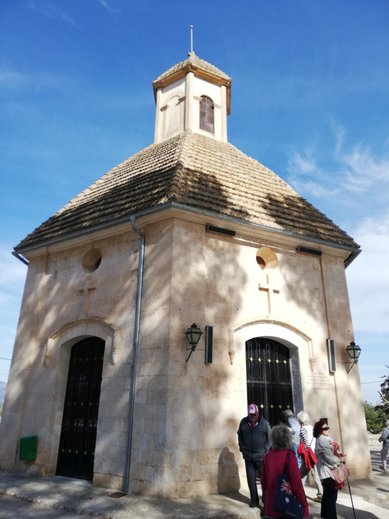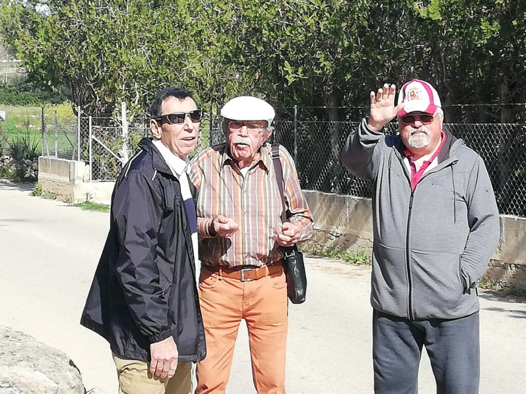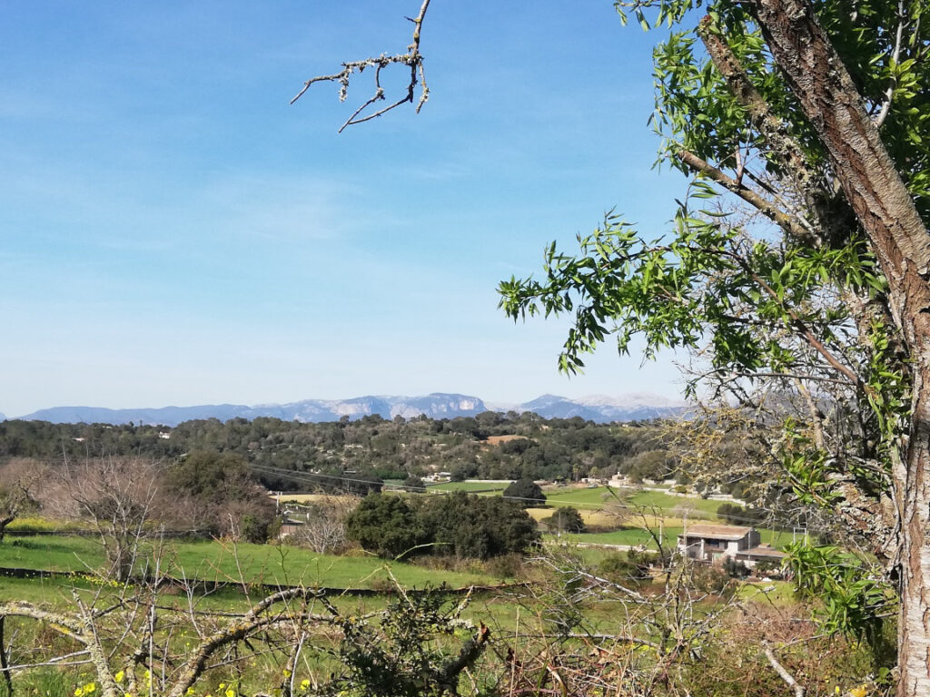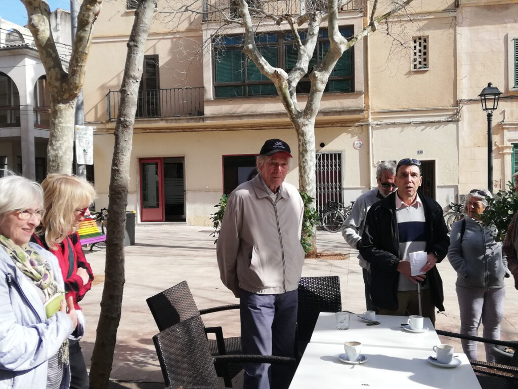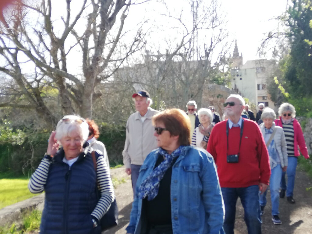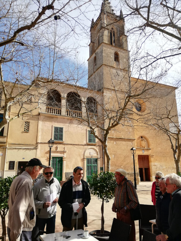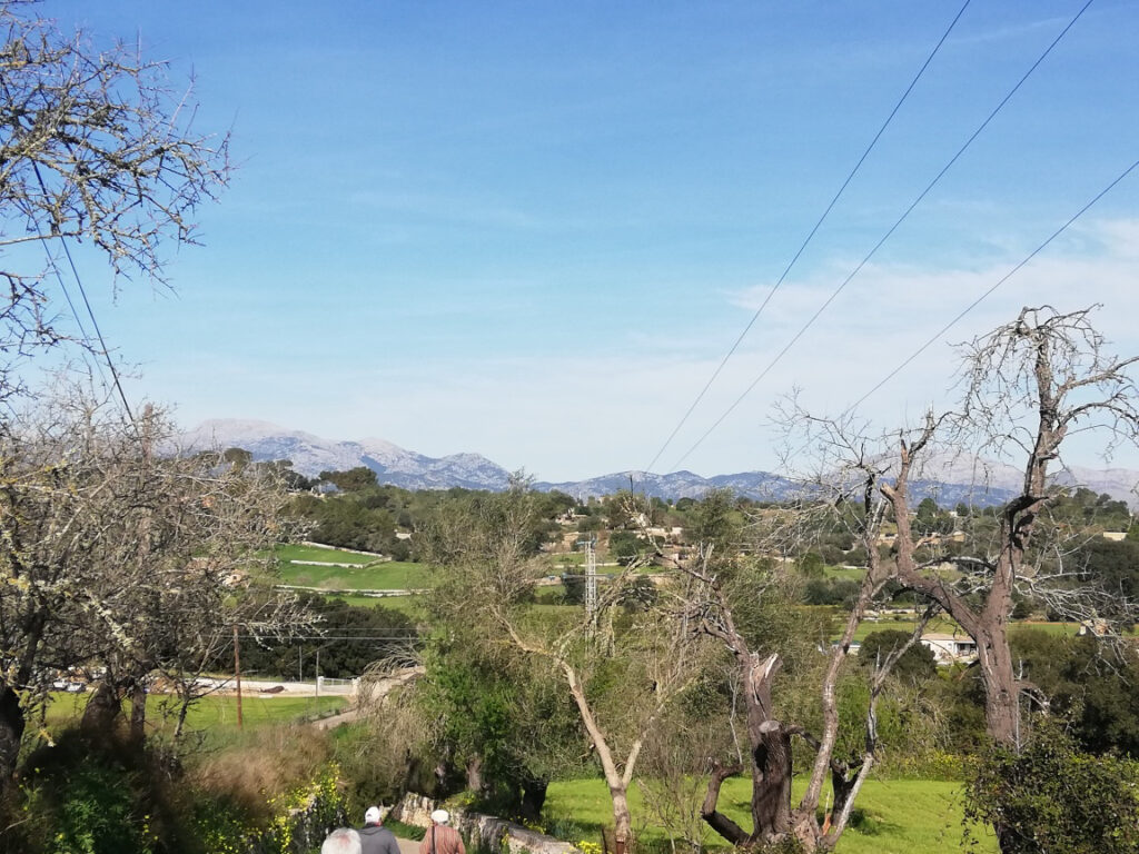 Punkt 11.15 Uhr ging es dann los mit unserer Wanderung. Nach ein paar Schritten waren wir schon am oberen Dorfrand. Da hatte man den wunderbaren Ausblick, Richtung Westen, auf die ganze Gebirgskette Tramuntana. Dieser Ausblick begleitete uns die halbe Wanderung. Zuerst ging es ein Stück bergab bis zur alten Brücke des Dorfbachs Vinagrella, danach wieder bergauf bis zur Ermita de Sant Crist. Dort erzählte uns Manuela unter anderem, dass die Ermita sechseckig ist und 1860 erbaut wurde. Nach einer kurzen Rast wanderten wir auf schmaler Strasse weiter, vorbei an vereinzelten Anwesen und Fincas, bis zum Bahnhof der etwa 3Km von Llubi entfernt ist. Manuela wusste zu erzählen, dass das Bahngeleise etwa 1878 eingeweiht wurde und als Dampfzug, zwischen Inca und Sa Pobla verkehrte und für den Transport von Produkten aus der Landwirtschaft eingesetzt wurde. 1981 wurde er stillgelegt und im Jahr 2000 wieder für den Personenverkehr zwischen Palma und Muro mit Diesel betrieben. Seit ein paar Jahren ist er modernisiert und fährt elektrisch. Auf der schmalen Strasse neben dem Bahngeleise ging es Richtung Süden weiter. Bei einem schönen Holzgatter, bogen wir links auf einem Naturweg ein, an blühenden Olivenbäumen und grasenden Pferden vorbei. Unter der Brücke der Hauptstrasse erreichten wir wieder den Dorfbach. Den konnten wir problemlos überqueren da er trocken war. Auf dem geteerten Weg bis zum Dorfeingang, konnte man schon den Kirchturm erblicken. Auf der Zielgerade durchs Dorf kamen wir an einen kleinen Platz mit dem ältesten Orts-Kreuz. Danach passierten wir eine restaurierte Mühle, das Dorftheater mit der Bibliothek und zum Schluss noch das Gemeinde-Haus. Nach wenigen Schritten war das Ziel, den Kirchplatz mit dem Restaurant „Bar S´acusticafe“ erreicht. Super ! Alle haben es geschafft !