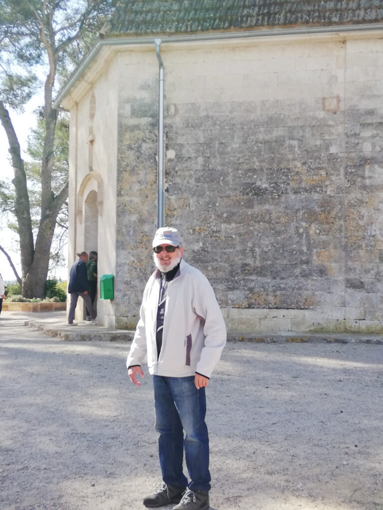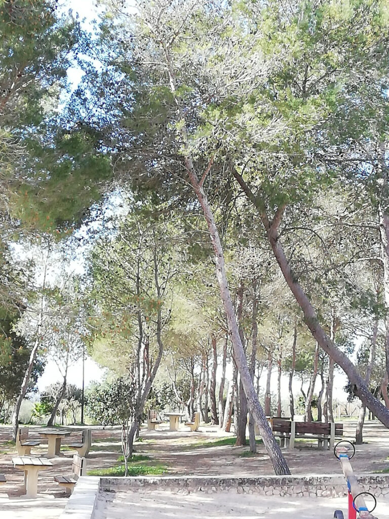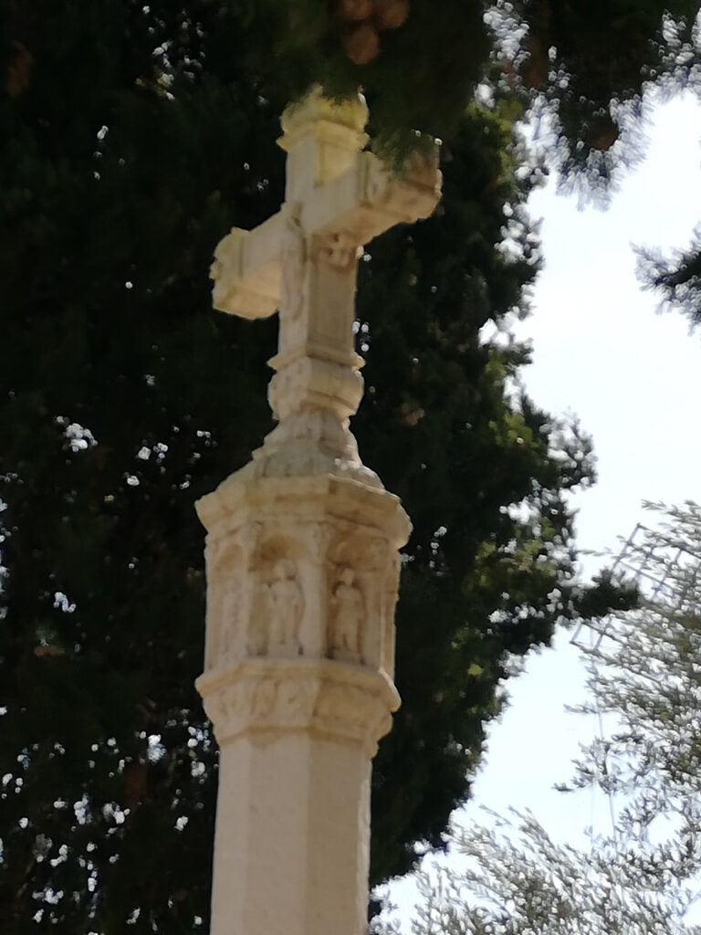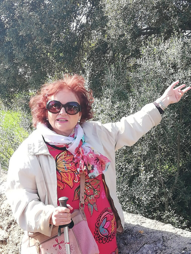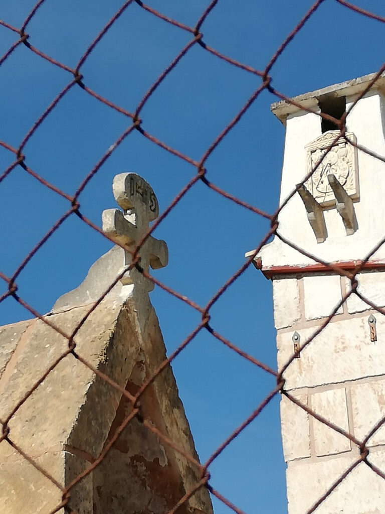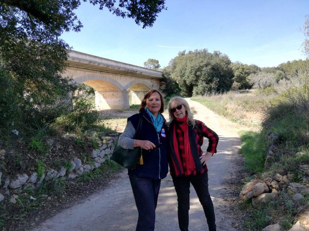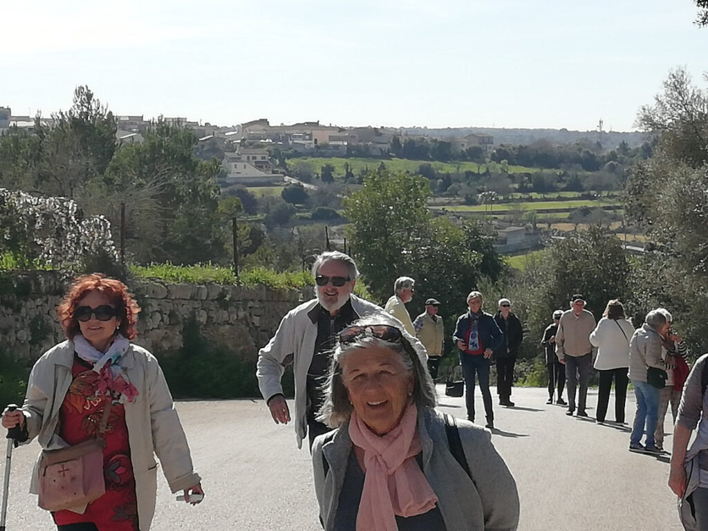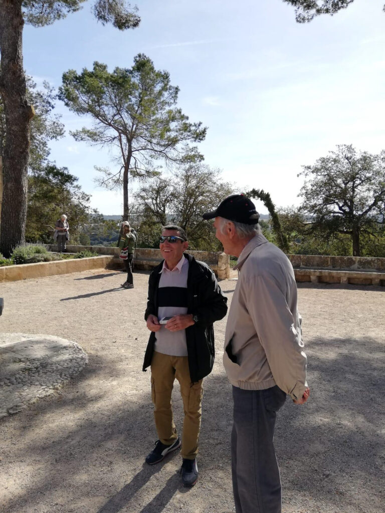Punkt 11.15 Uhr ging es dann los mit unserer Wanderung. Nach ein paar Schritten waren wir schon am oberen Dorfrand. Da hatte man den wunderbaren Ausblick, Richtung Westen, auf die ganze Gebirgskette Tramuntana. Dieser Ausblick begleitete uns die halbe Wanderung. Zuerst ging es ein Stück bergab bis zur alten Brücke des Dorfbachs Vinagrella, danach wieder bergauf bis zur Ermita de Sant Crist. Dort erzählte uns Manuela unter anderem, dass die Ermita sechseckig ist und 1860 erbaut wurde. Nach einer kurzen Rast wanderten wir auf schmaler Strasse weiter, vorbei an vereinzelten Anwesen und Fincas, bis zum Bahnhof der etwa 3Km von Llubi entfernt ist. Manuela wusste zu erzählen, dass das Bahngeleise etwa 1878 eingeweiht wurde und als Dampfzug, zwischen Inca und Sa Pobla verkehrte und für den Transport von Produkten aus der Landwirtschaft eingesetzt wurde. 1981 wurde er stillgelegt und im Jahr 2000 wieder für den Personenverkehr zwischen Palma und Muro mit Diesel betrieben. Seit ein paar Jahren ist er modernisiert und fährt elektrisch. Auf der schmalen Strasse neben dem Bahngeleise ging es Richtung Süden weiter. Bei einem schönen Holzgatter, bogen wir links auf einem Naturweg ein, an blühenden Olivenbäumen und grasenden Pferden vorbei. Unter der Brücke der Hauptstrasse erreichten wir wieder den Dorfbach. Den konnten wir problemlos überqueren da er trocken war. Auf dem geteerten Weg bis zum Dorfeingang, konnte man schon den Kirchturm erblicken. Auf der Zielgerade durchs Dorf kamen wir an einen kleinen Platz mit dem ältesten Orts-Kreuz. Danach passierten wir eine restaurierte Mühle, das Dorftheater mit der Bibliothek und zum Schluss noch das Gemeinde-Haus. Nach wenigen Schritten war das Ziel, den Kirchplatz mit dem Restaurant „Bar S´acusticafe“ erreicht. Super ! Alle haben es geschafft !